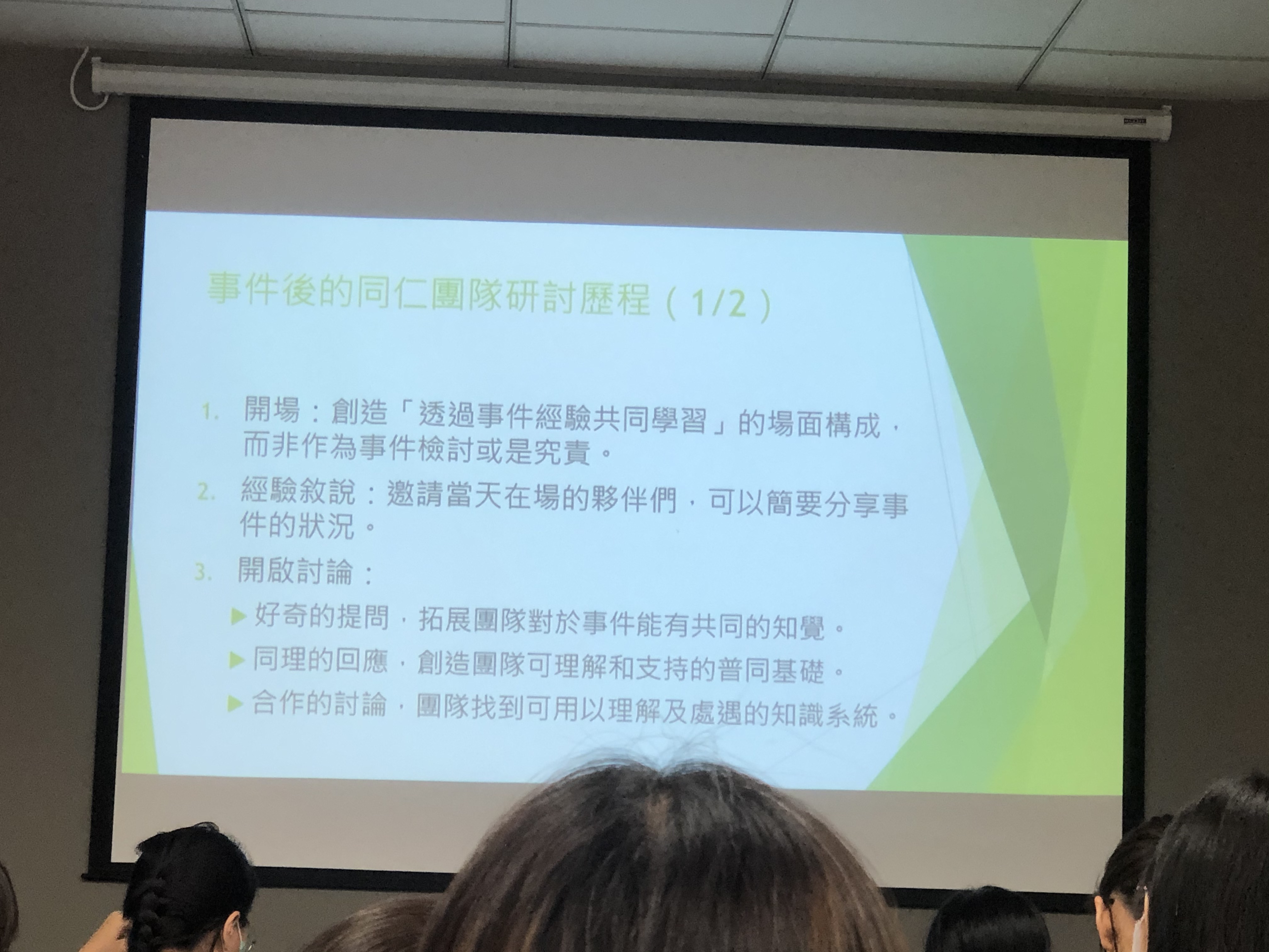 A:在我的程序裡有個地方是,要所有人都談自己的感受跟經驗。即便不在現場也會受到影響。團隊相互共鳴,不能停留在受傷,而是要有支持性,要進入到「我們相互還能做什麼」,會對那個狀態更有掌控感、安全感。