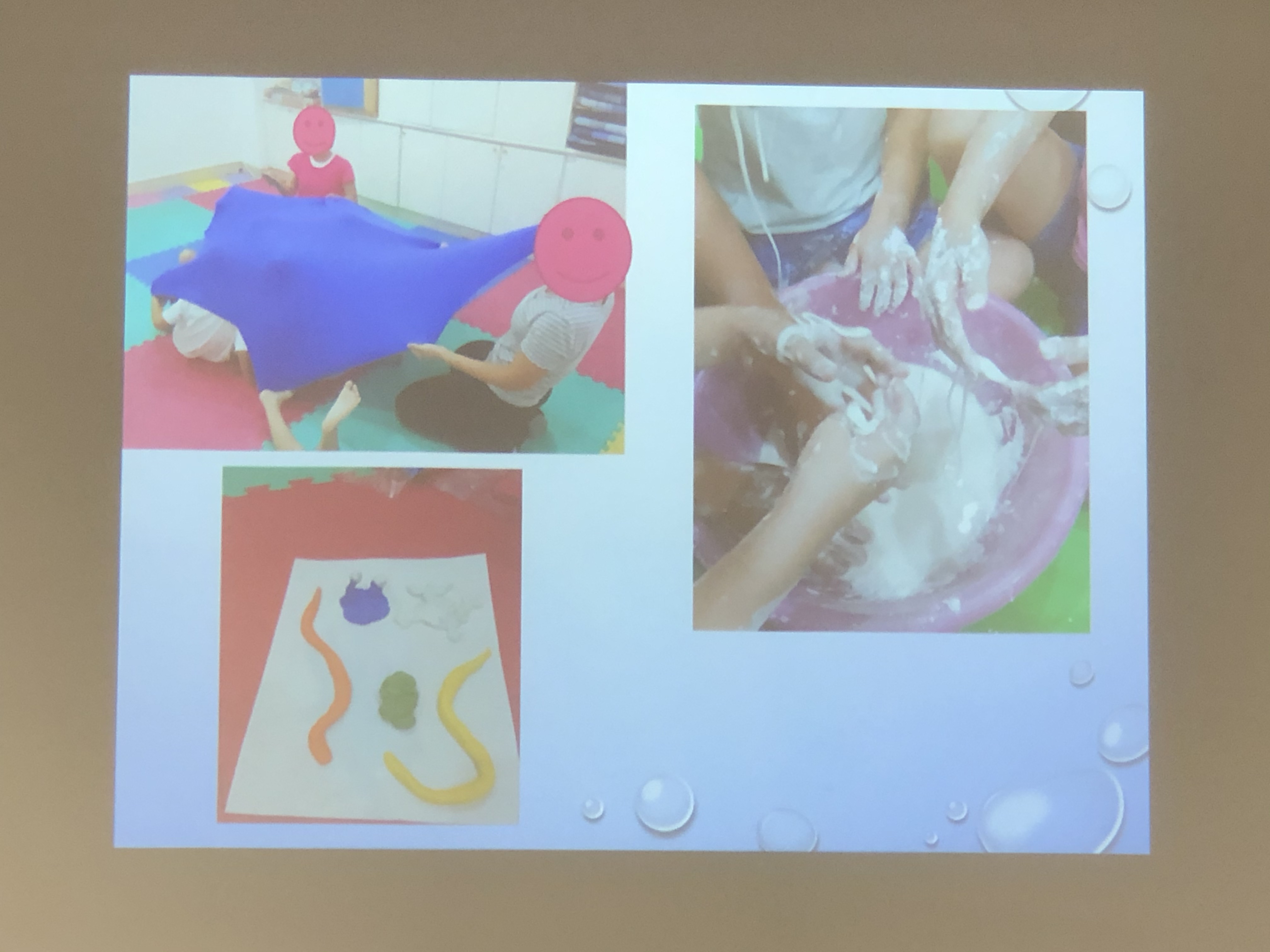 媒材:酒精墨水的流動畫,和諧粉彩、彩色鹽罐、彈性布(讓球滾到指定地方、躺在上面把她包起來)、氣球傘、黏土、玉米粉加水加顏料(觸感很有趣)